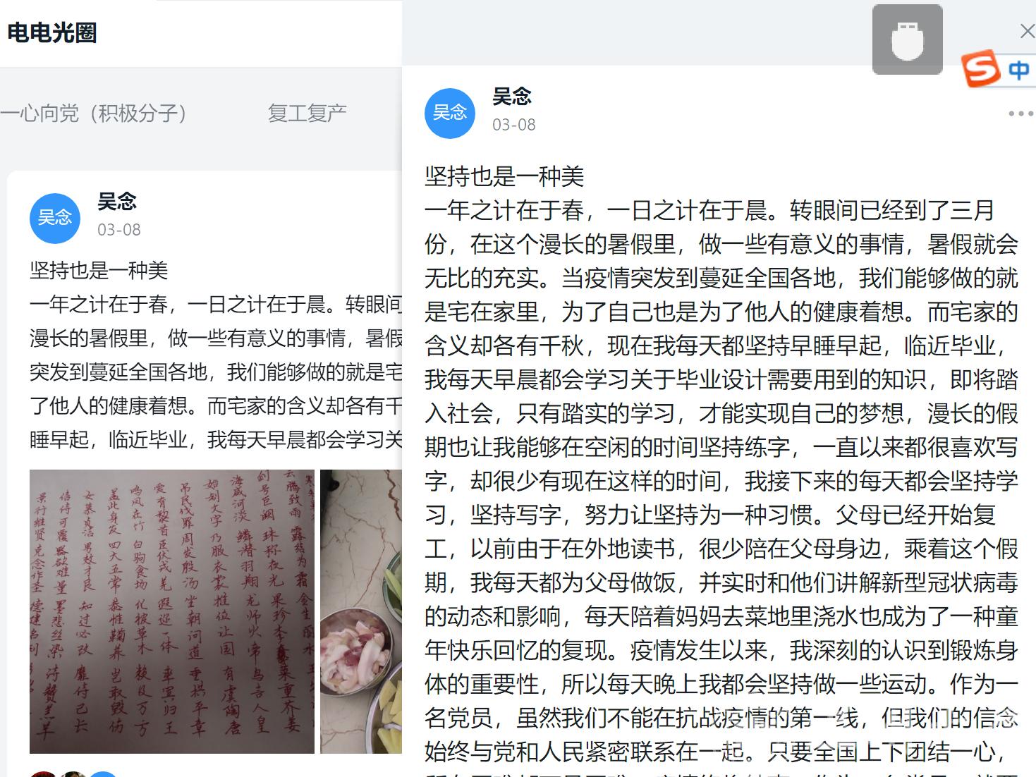 受新冠肺炎疫情影响,高校开展线上教学,大学生们在家上网课已成为一种常态,为深入贯彻中央和省市委关于统筹推进疫情防控和经 济社会发展工作的系列决策部署,加强疫情期间学生党员教育管理,欧美无码 开展党日活动,要求学生党员自主发布党员日记记录自己居家学习生活。学生党员们有的分享自己在家孝敬父母的小事,有的记录自己有条不紊的学习计划,有的分享自己参加社区志愿服务的经历,有的介绍自己助力复工复产的实习生活,有的表达自己对党和国家的信心......